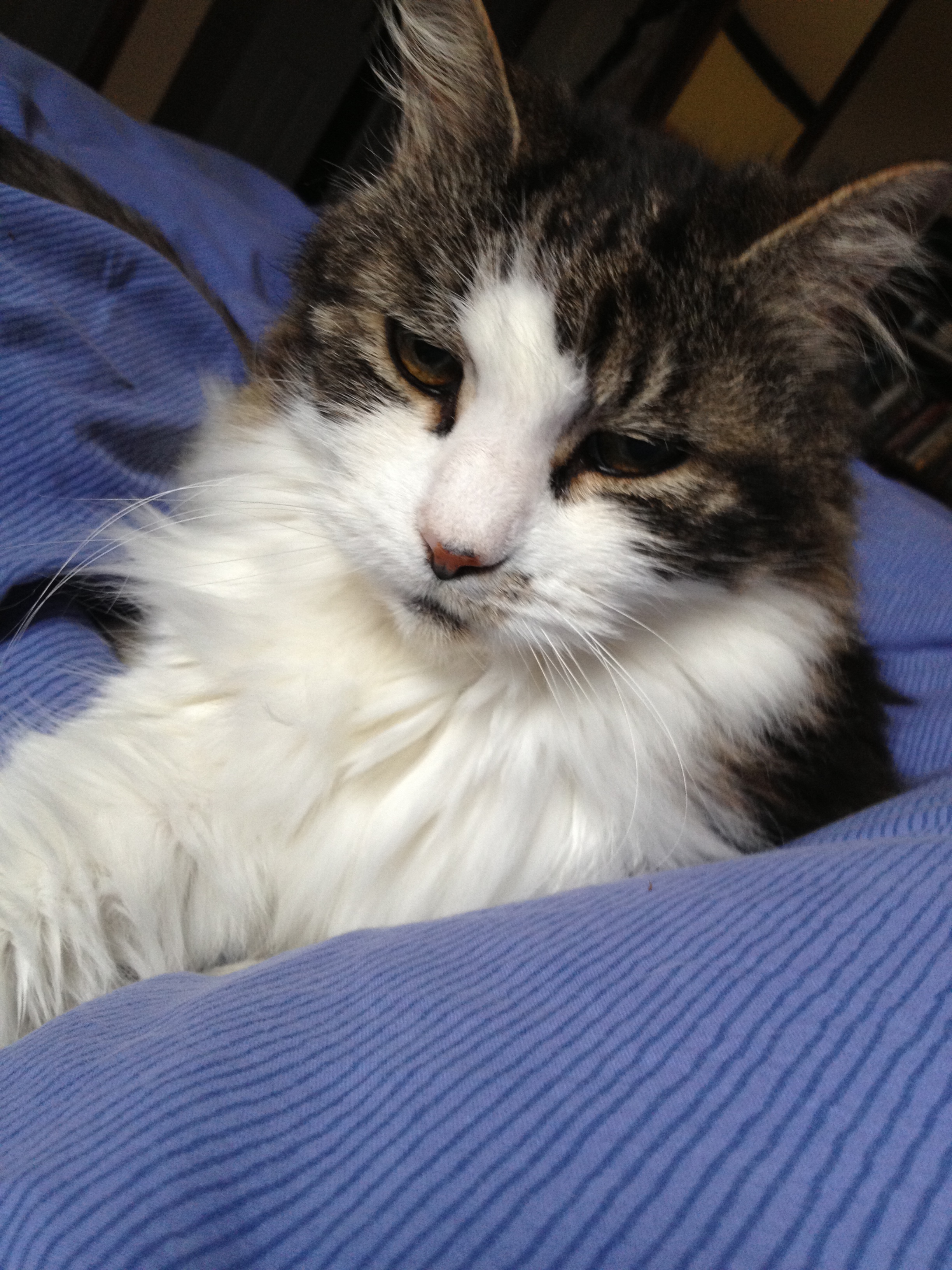 And then, last Monday evening I went upstairs to bring him down for the night and saw him sleeping on my bed. I said hello, and he didn’t purr. I knew before I looked properly that he had died: a George who didn’t purr was not George. He looked so peaceful, he must have gone in his sleep, and so recently he was still warm. I was there, holding his paw and weeping, when my husband got home and found us.